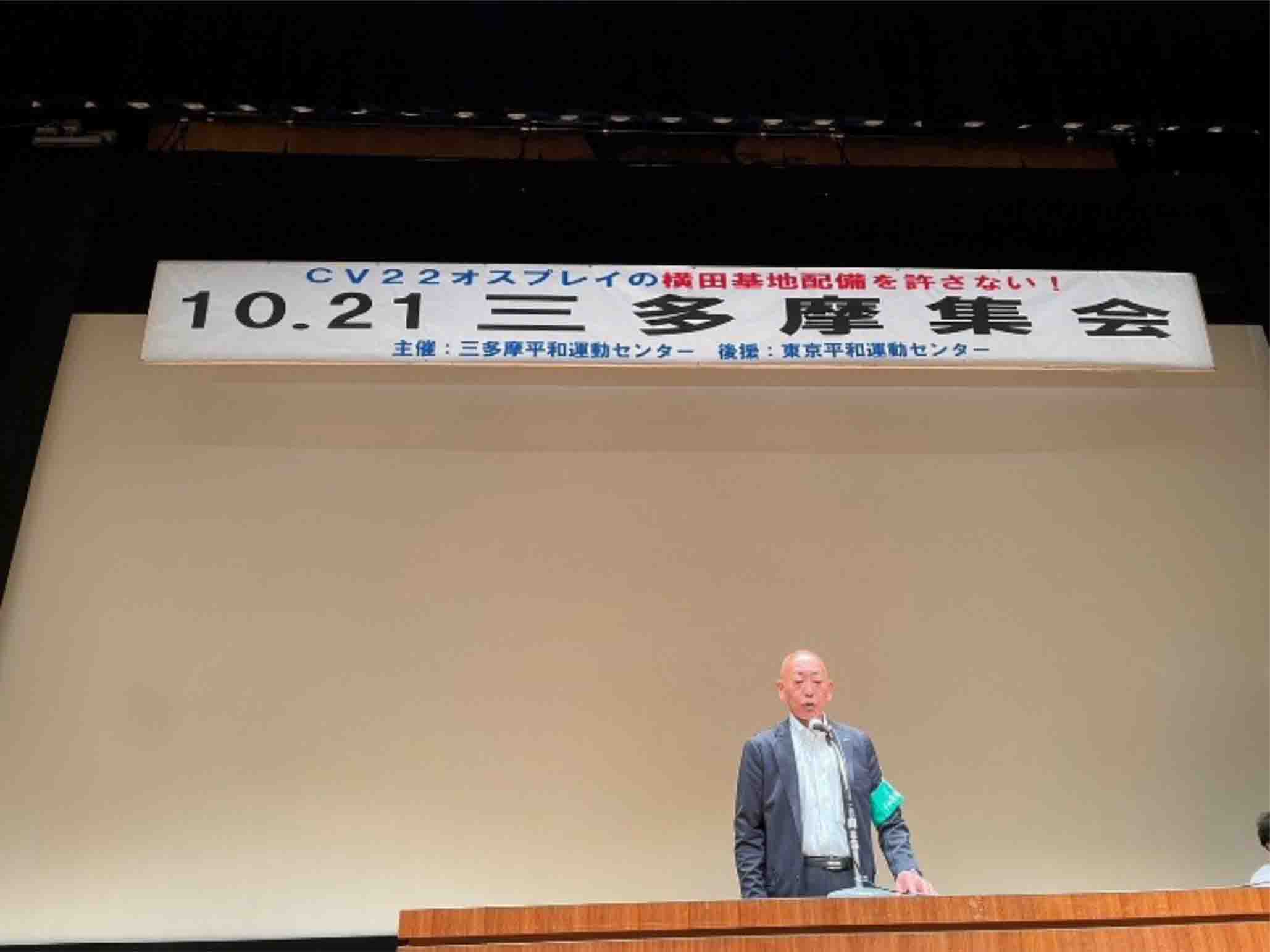 主催者代表の三多摩平和運動センター土岐雅人議長は、10.21国際反戦デーに集会を続けてきたことを紹介しながら三多摩における反戦運動の取り組みとオスプレイの横田基地配備反対の闘いを振り返り、欠陥機オスプレイの配備を許さず横田基地の整理・縮小・撤去の闘いを粘り強く続ける決意を述べ引き続き平和センターへの結集を呼びかけました。集会には、東京平和運動センターから桐田達也事務局、平和運動センター関東ブロックから金子彰事務局長が参加し連帯のあいさつを行いました。