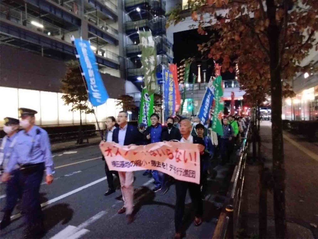 三多摩平和運動センター寺村幹事の提案による「集会アピール」を会場全体で確認し、土岐議長の団結ガンバローで閉会した後、参加者は会場の福生市民会館からJR福生駅東町公園までのデモ行進を行い、オスプレイ配備反対、横地基地撤去を訴えました。