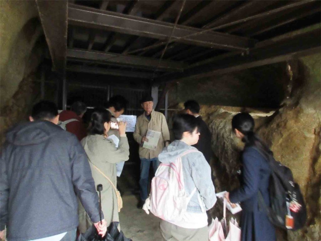 百穴の駐車場で地元埼玉の参加者とも合流し、軍需工場跡の調査と関係者への取材を行ってきたもと高校教師の江藤善章さんから、軍需工場跡の構造や建設の経過などについてくわしく解説をしていただきました。