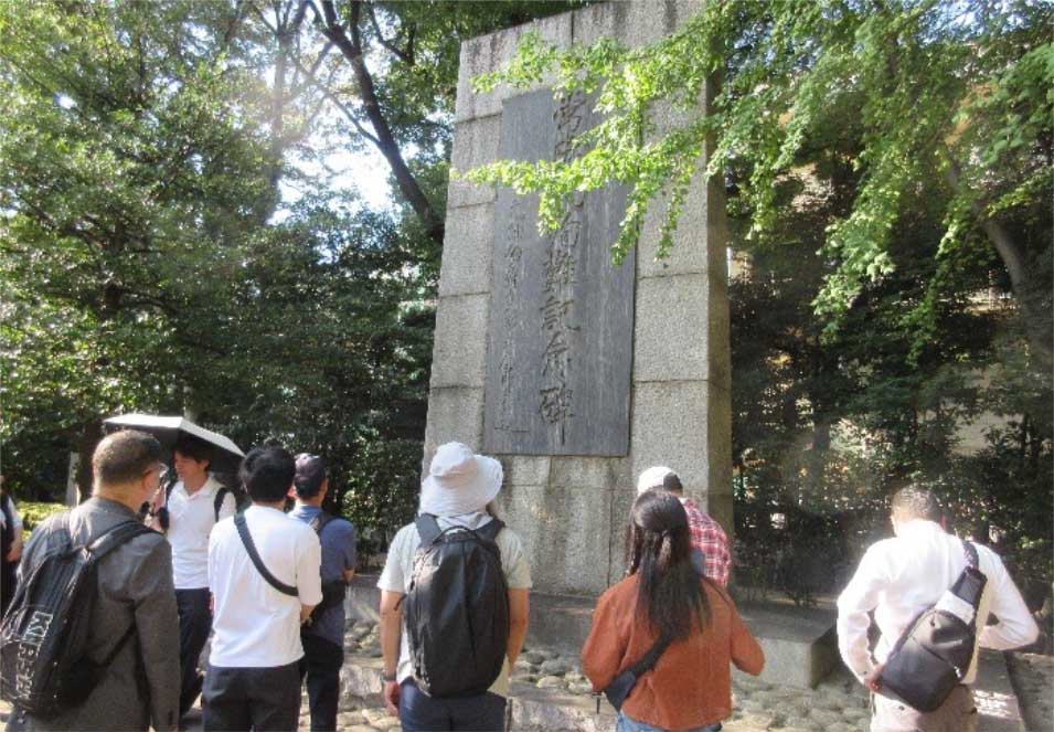 12時半に靖国神社の社号標前に集合した参加者は二つの班に分かれて、東京教組多摩支部委員長の宮澤弘道さんの解説とガイドブックで、靖国神社の外苑・内苑をめぐり、遊就館を見学しました。