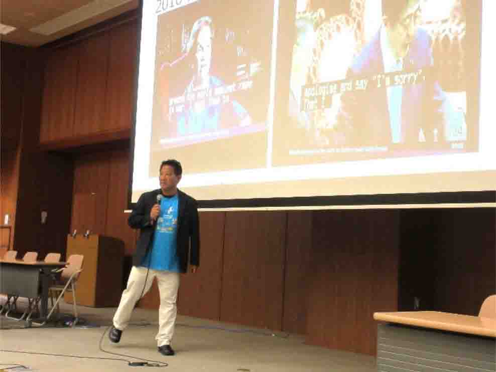 さらに飯島さんは、日本軍が沖縄戦の前に何をしてきたかと、日本軍の加害について、マレーシアのコタバル戦争記念館や、シンガポールの旧フォード博物館の展示資料を示して解説しました。日本軍がこうした地域で、虐殺やレイプなど非人道的行為を繰り返した背景に、公教育や家制度、靖国神社を通して国民に「愛国心」を植え付け、国家のために死ぬことを強制したと強調しました。そして「権力者や上層部は1944年10月から長野に松代大本営を建設し、自分たちはいざとなれば真っ先に逃げる準備をしていた」と怒りを込めて訴えました。