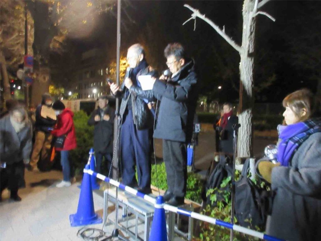 強い寒波の襲来で厳しい寒さの一日となった12月19日、午後6時半から衆議院第二議員会館前で「軍拡ではなく暮らしを守れ!the END自民党政治第109回国会議員会館前行動」が開催されました。