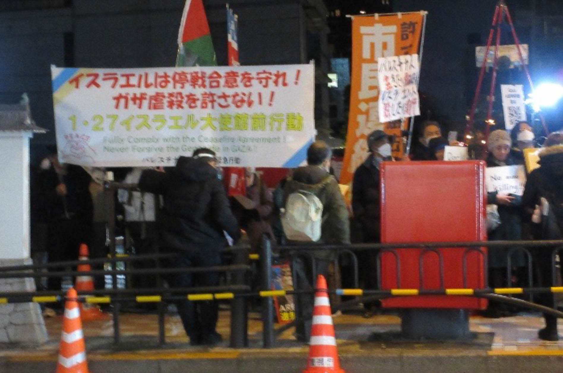 ハマスとイスラエルとの停戦合意が発効してから1週間目を迎えた1月27日、午後6時から麹町のイスラエル大使館前でイスラエルに対する抗議行動が行われました。