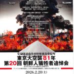 2026年2月17日 / 最終更新日 : 2026年2月17日 arcp-peace 2026年2月28日 東京大空襲81年 第20回朝鮮人犠牲者追悼会 2月28日(土)午後2時「東京大空襲81年 第20回朝鮮人犠牲者追悼会」 主催者:東京大空襲朝鮮人犠牲者を追悼する会 チラシはこちらから