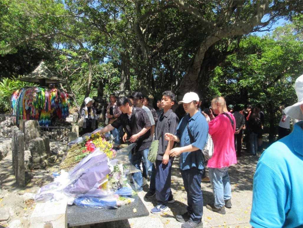 平和行進の前日に沖縄入りした派遣団は、那覇空港で平和ガイドの宮川さんと合流し、南部戦跡巡りに向かいました。宮川さんの丁寧な説明を受けながら、魂魄の塔~ひめゆりの塔~平和記念公園資料館・平和の礎を見学し、沖縄戦の実相の一端を学びました。