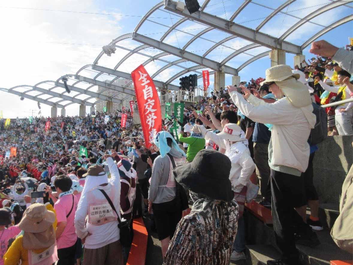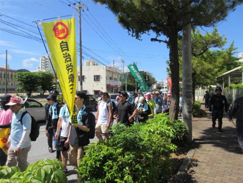 翌日は、嘉数高台公園からAgreスタジアム北谷までの「普天間コース」を行進しました。右翼の街宣車による大音量の妨害を受けながらも、元気よく行進する行進団に、沿道から住民が手を振ったり、拍手で激励したりしてくれたことで、より元気が出ます。「パンパン!」と響いたのは、保育園の子どもたちが行進団の応援のために叩いてくれたパーランクルの音でした。